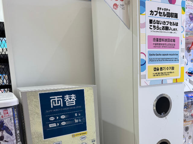 ガチャポンの近くには、このような両替機とカプセル回収BOXなどが設置されている場合が多いです。